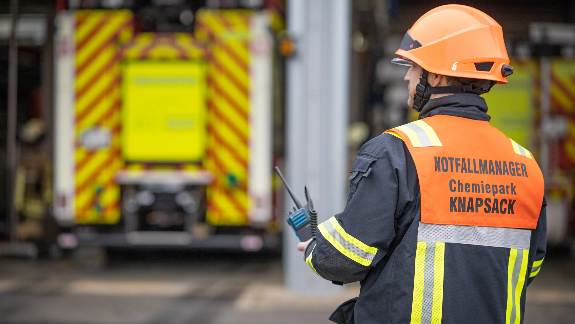 Ob Brand, Stoffaustritt oder ein Unfall – sollte es doch einmal zu einem akuten Schadensereignis kommen, sind wir gut vorbereitet. Denn dann heißt es: schnell und effizient arbeiten, um das Ereignis unter Kontrolle zu bringen und alle Beteiligten zu informieren. Im Chemiepark Knapsack ist deshalb rund um die Uhr ein erfahrener und speziell geschulter Notfallmanager im Einsatz. Er beurteilt im Alarmfall gemeinsam mit dem Einsatzleiter der Feuerwehr die Gefahrenlage, veranlasst die Warnung der Nachbarschaft und ruft bei Bedarf den Werkskrisenstab ein. Hier stehen erfahrene und speziell geschulte Mitarbeiter*innen aus dem Chemiepark als kompetente Ansprechpartner für Einsatzkräfte, Behörden sowie Presse und Öffentlichkeit zur Verfügung.