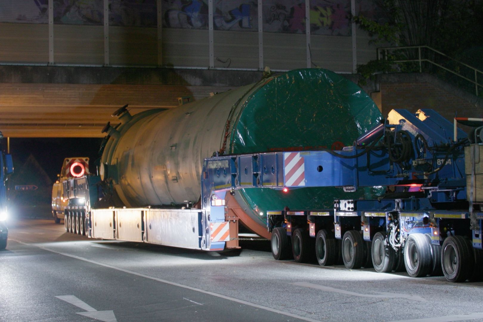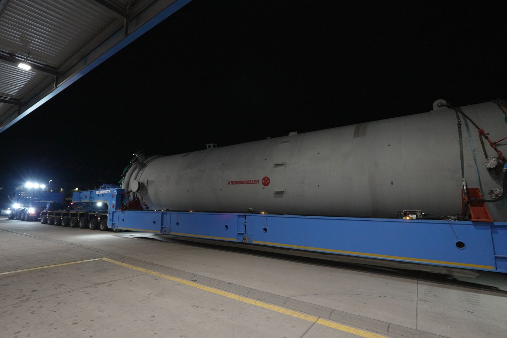 Der Reaktor wurde von Kremsmüller in Österreich gefertigt. Ursprünglich war geplant, ihn in einem Stück zu liefern, doch es gab kein Fahrzeug, das die Gesamtlast hätte tragen können. Die drei Teile des Reaktors wurden daher separat mit dem Spezialtransportunternehmen Felbermayr auf die Reise geschickt. Der Mittelteil wiegt mit Abstand am meisten, weil im Inneren ein Kühlbündel mit Schlangenrohren verbaut ist. Das Gesamtgewicht des Transports lag mit 97 Prozent Auslastung am absoluten Limit. Zunächst ging es über Autobahnen und Landstraßen von Steinhaus in der Nähe von Linz bis an die Donau. Dort wurde der Reaktor auf ein Schiff verladen und über Donau und Rhein bis nach Krefeld gebracht. Hier übernahmen Höhle und das Transportunternehmen den Weg bis zum Chemiepark.