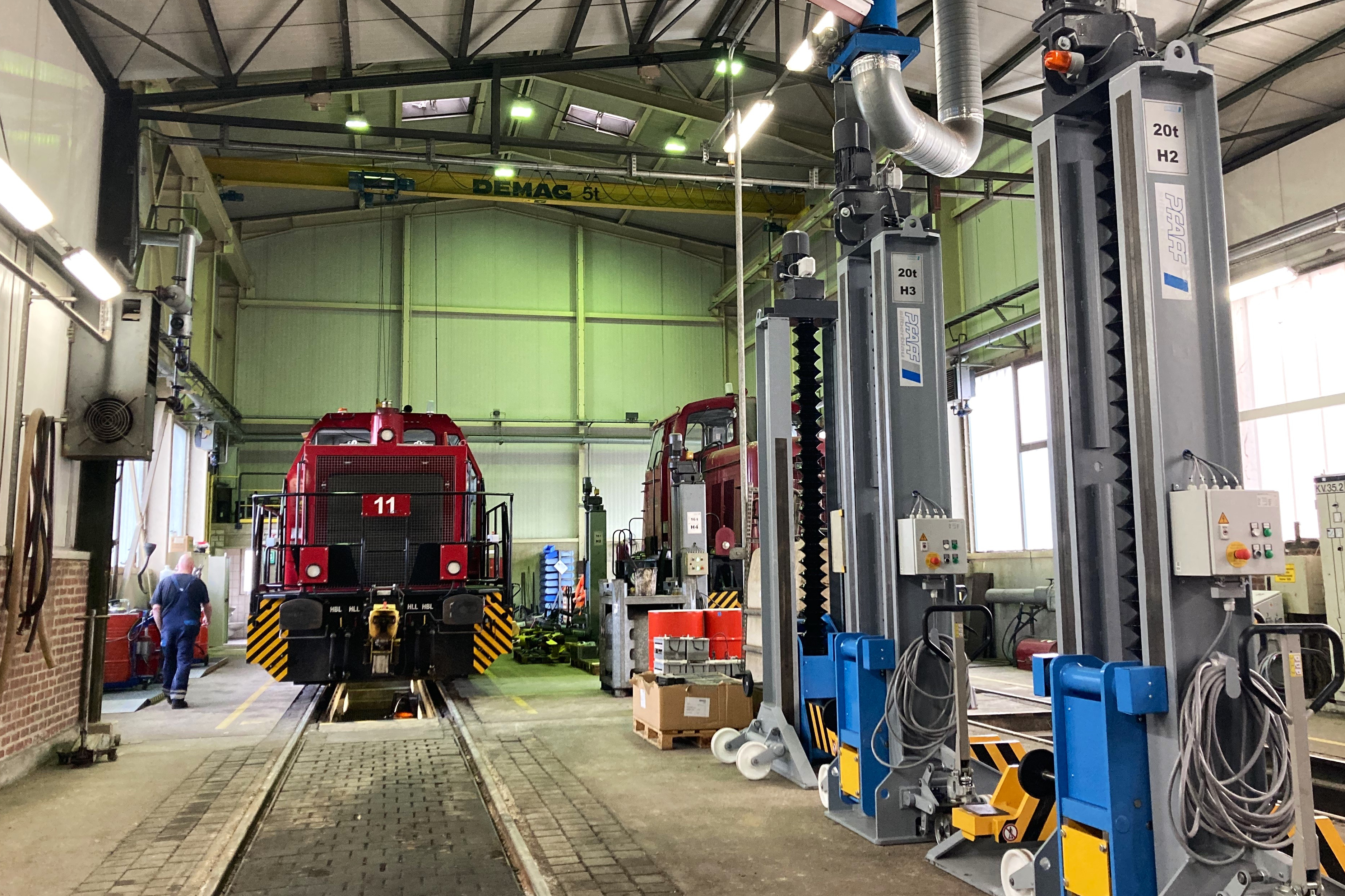 Die vier Elemente der neuen Hebebockanlage stemmen gemeinsam 80 Tonnen und liegen damit deutlich über der Tragkraft der bereits vorhandenen Anlage, die ein Gesamtgewicht von 64 Tonnen anheben und absenken kann. Grund für den Neuerwerb sind die Schwergewichte Lexy und July. Die beiden Rangierloks sind die jüngsten Neuzugänge im eisenbahntechnischen Fuhrpark von YNCORIS aus dem Dezember 2021. „Planmäßig wird bei den Loks alle acht Jahre die Hauptuntersuchung durchgeführt. Spätestens dann hätten wir die neue Hebebockanlage gebraucht“, erklärt Weinert. Auch bei Reparaturen, wie zum Beispiel an der Achse oder an den Bremsen, müssen die Loks angehoben werden. Die neue Anlage garantiert dann Handlungsfähigkeit.
