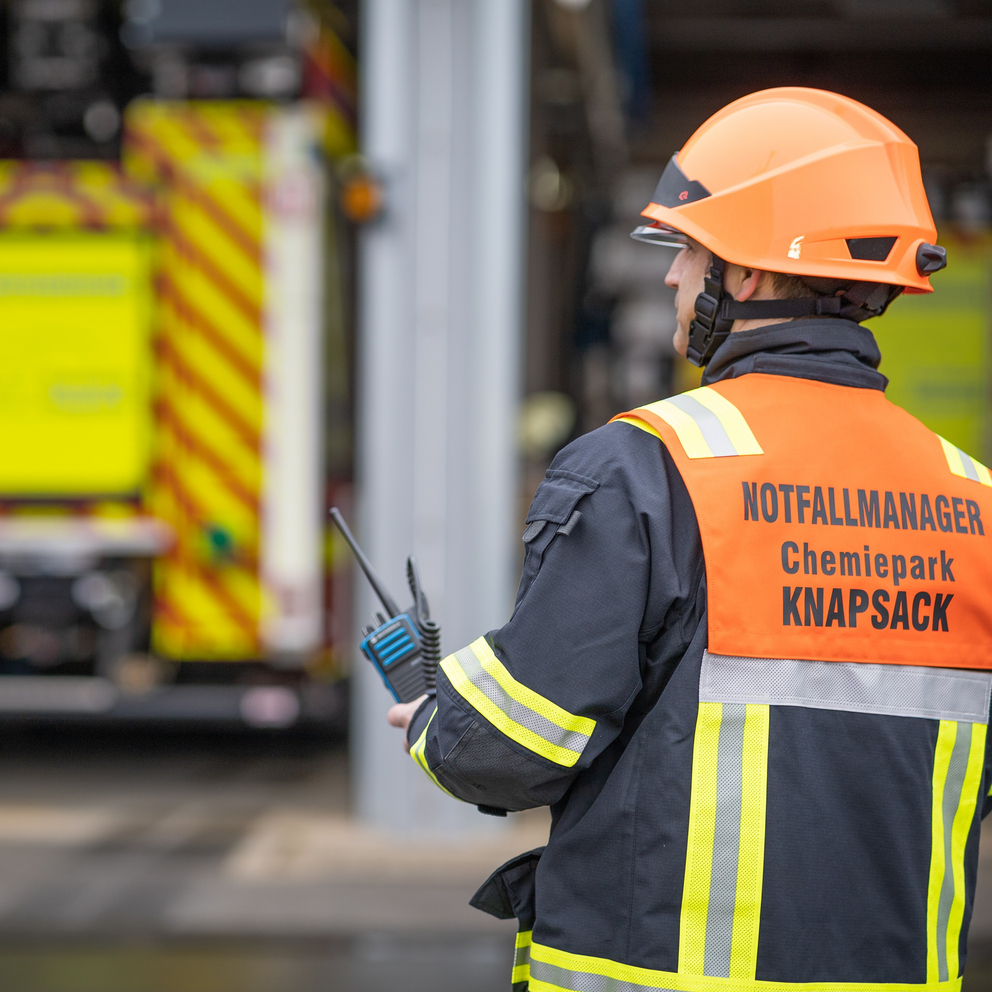 Ob Brand, Stoffaustritt oder ein Unfall – sollte es doch einmal zu einem akuten Schadensereignis kommen, sind wir gut vorbereitet. Denn dann heißt es: schnell und effizient arbeiten, um das Ereignis unter Kontrolle zu bringen und alle Beteiligten zu informieren. Im Chemiepark Knapsack ist deshalb rund um die Uhr ein erfahrener und speziell geschulter Notfallmanager im Einsatz. Er beurteilt im Alarmfall gemeinsam mit dem Einsatzleiter der Feuerwehr die Gefahrenlage, veranlasst die Warnung der Nachbarschaft und ruft bei Bedarf den Werkskrisenstab ein. Hier stehen erfahrene und speziell geschulte Mitarbeiter*innen aus dem Chemiepark als kompetente Ansprechpartner für Einsatzkräfte, Behörden sowie Presse und Öffentlichkeit zur Verfügung.