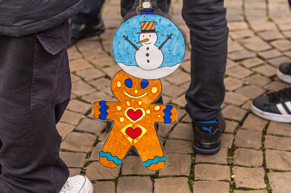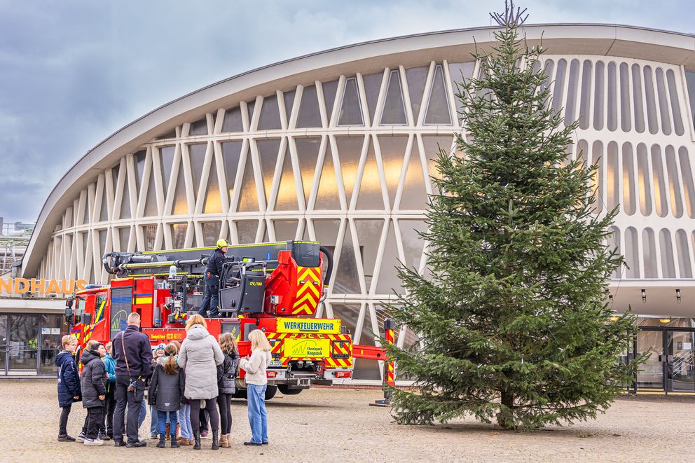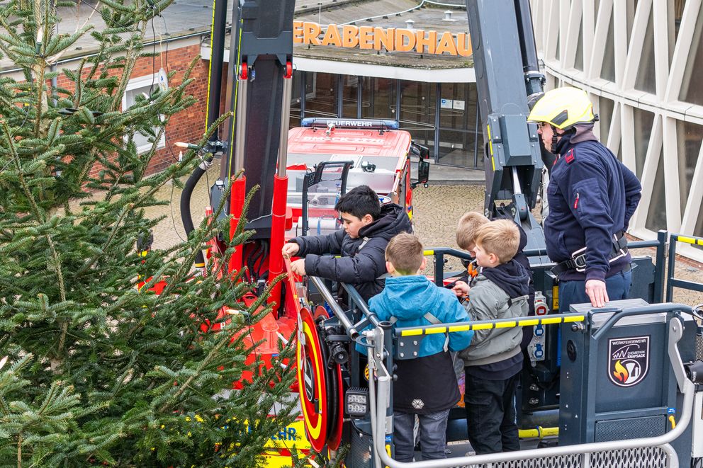Schulkinder schmücken den Weihnachtsbaum gemeinsam mit der Werkfeuerwehr.
