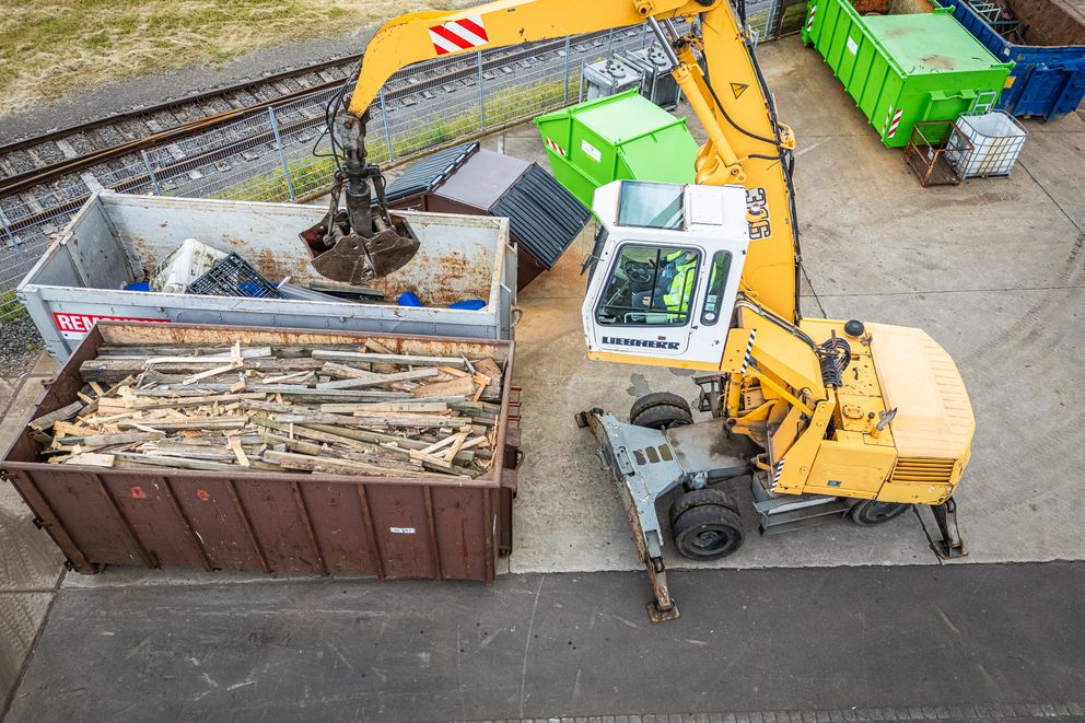 Langweilig wird es Mibis nie, auch wenn er allein arbeitet. „Hier ist fast immer jemand, der etwas abgeben oder abholen möchte.“ Denn in kurzen Abständen kommen Mitarbeitende der Standortunternehmen mit Abfall vorbei oder die Entsorger holen volle Container ab und tauschen sie gegen leere aus. „Im letzten Jahr haben wir hier knapp 700 Tonnen Material umgeschlagen“, so Mibis weiter. Außerdem fährt er Container zu Kunden oder holt sie ab.