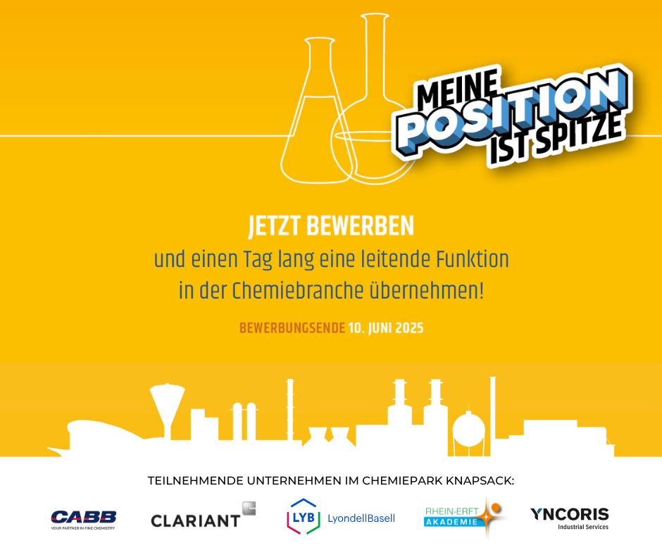 Gemeinsam mit 26 Chemieunternehmen aus dem Rheinland startet die Kölner Brancheninitiative ChemCologne 2025 zum elften Mal die Aktion „Meine Position ist spitze“. Insgesamt stellen die Mitgliedsunternehmen 44 Spitzenpositionen für einen Tag zur Verfügung, auf die sich interessierte Schülerinnen und Schüler ab 16 Jahren aus der Region bis zum 10. Juni 2025 bewerben können.