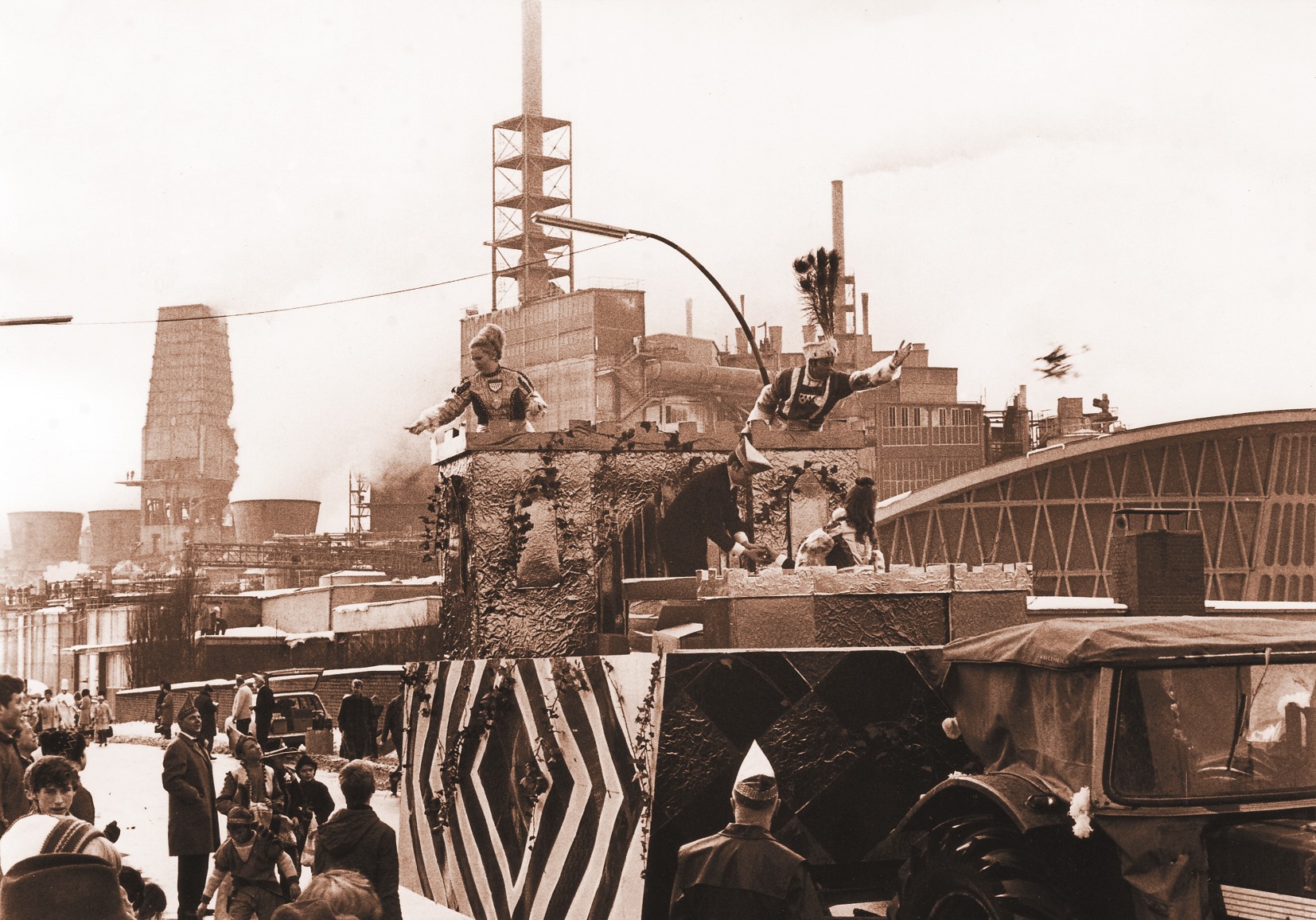 Die Aufnahmen stammen vom Knapsacker Karnevalszug aus dem Jahr 1969. Die Jecken auf den Bildern ziehen gerade durch die Hermann-Josef-Straße. Im Hintergrund seht ihr das Feierabendhaus und die Phosphorbetriebe.
