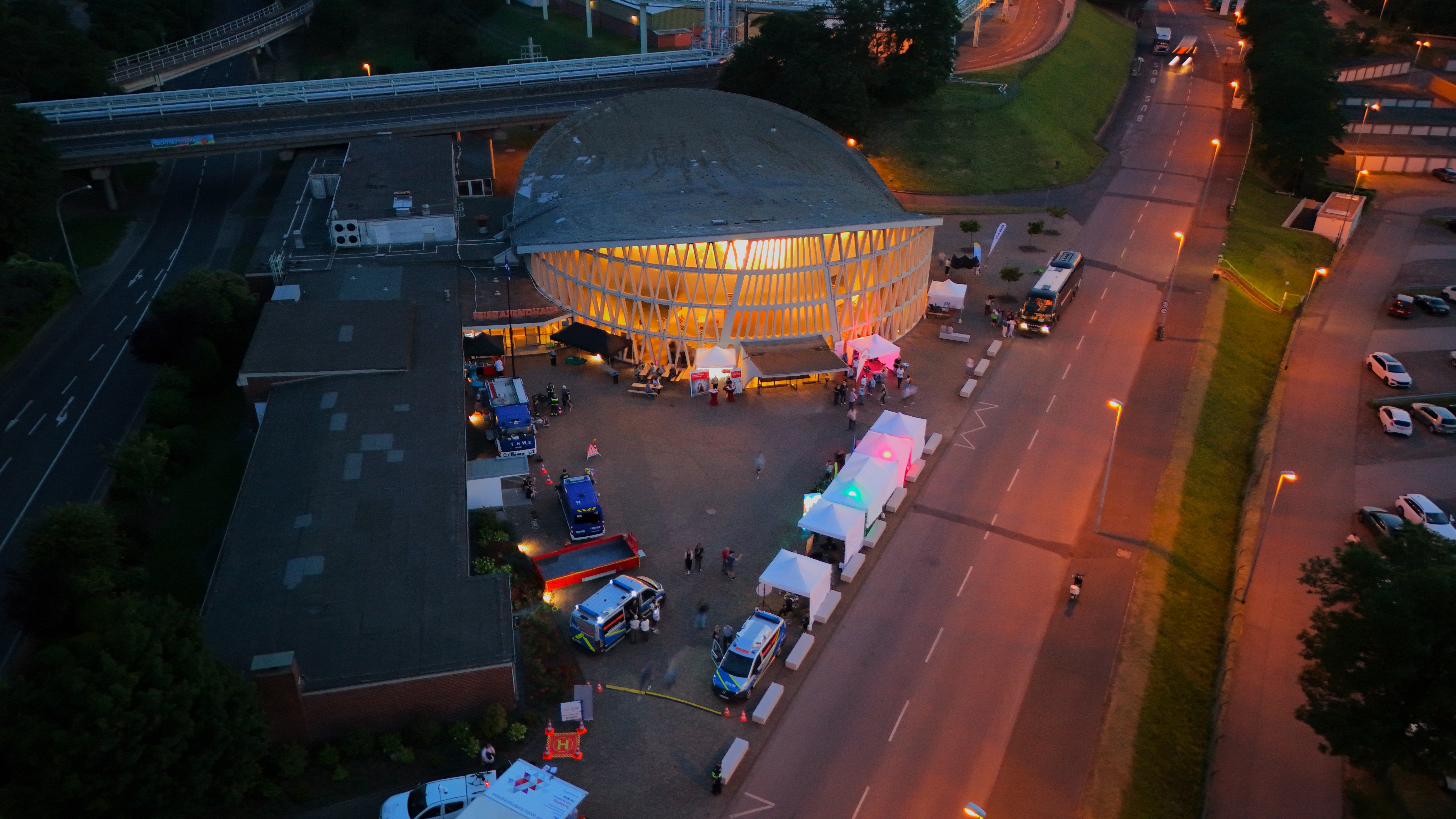 Es ist 22:00 Uhr, die Sonne ist bereits untergegangen, doch richtig dunkel ist es noch nicht. Das Feierabendhaus beleuchtet von innen heraus den Vorplatz, blaue und pinkfarbene Scheinwerfer tauchen die aufgestellten Stände und Fahrzeuge in besonderes Licht. Gleich soll die letzte Busrundfahrt beginnen. Hier wollen auch der elfjährige Hannes und der neunjährige Niklas mit ihrer Mutter Katharina Hammersen teilnehmen. Ob es klappt, wissen sie noch nicht, denn die Karten waren schon lange im Vorfeld ausverkauft – wie auch die für alle anderen Attraktionen im Chemiepark. Den Feuerlöschtrainer vor der Wache der Werkfeuerwehr haben die beiden Jungs schon getestet und die unterschiedlichen Fahrzeuge bestaunt.