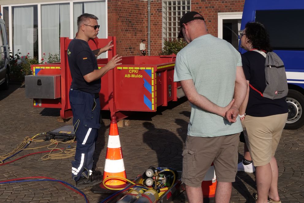 Auf dem Vorplatz vor dem Feierabend ist bereits den ganzen Abend viel los. Menschen aller Generationen informieren sich an den Ständen, nehmen Sicherheitswesten für Ihre Führung durch die verschiedenen Produktionsanlagen im Chemiepark entgegen oder stärken sich an der Essens- und Getränkestation. Mehrere Organisationen informieren über ihre Arbeit mit Jugendlichen, Mitarbeiter des Bundesamts für Logistik und Mobilität erklären, wie sie während der Fahrt die Sicherheit von LKW kontrollieren. Dazwischen sorgt immer wieder der Roboterhund der EEW für Aufmerksamkeit, wenn er durch die Menge läuft. Der THW-Ortsverband Brühl präsentiert unter anderem ein Hebekissen in Aktion, mit dem sich auch schwere Lasten per Druckluft innerhalb kürzester Zeit anheben lassen. Hier steht ein Mitarbeiter aus dem Chemiepark – der einzige, der heute nicht in beruflichen Funktion aktiv ist. Björn Przybilla, Teamleiter Distribution bei YNCORIS, vertritt mit seinen Kollegen und Kolleginnen das Technische Hilfswerk (THW). Er engagiert sich dort bereits seit über neun Jahren und ist Gruppenführer der „Technischen Ortung“ in Brühl, also dem Team, das bei einer Explosion oder einem Hauseinsturz Verschüttete mit speziellen Geräten sucht. Warum ist er dort aktiv? „Nach meinem berufsbegleitenden Studium hatte ich wieder deutlich mehr Zeit – und die wollte ich für etwas nutzen, das eine Bedeutung hat.“ Sich für etwas Sinnvolles engagieren - dazu will das THW während der Nacht der Technik auch andere Menschen motivieren und auf die eigene Arbeit aufmerksam machen. Sie haben einen vollgepackten Gerätekraftwagen, kurz GKW, mitgebracht. Auf die Frage einer Besucherin, was denn dort so alles drin sei, kommt die Antwort: „Fragen Sie lieber, was nicht.“
