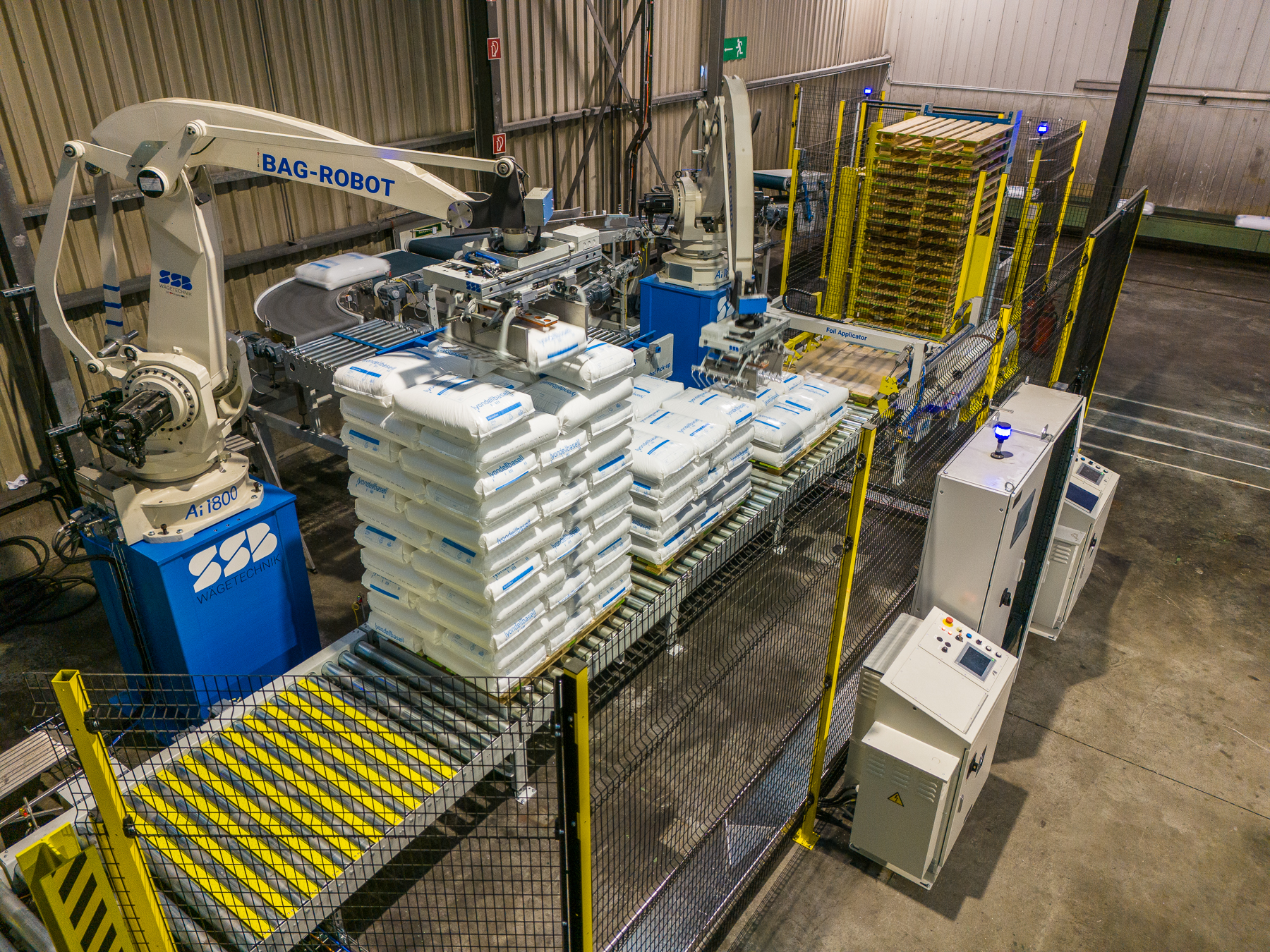 Schmidt und LyondellBasell haben in die Anlage rund eine Million Euro investiert. Das rechnet sich, denn es werden damit Umschlagszeiten und Kosten eingespart. „Einzeln kann jeder Roboter knapp 1.000 Sack pro Stunde bewegen, zusammen sind es etwa 1.700 bis 1.900 Säcke, je nach Produkttyp“, weiß Bergbold. „Das Anlagenlimit liegt bei 2.000 Sack/h. Die üblichen Produktionszeiten sind montags bis freitags von 6 bis 21 Uhr sowie samstags und sonntags bei Bedarf unseres Kunden.“ Somit komme man in der „normalen“ Arbeitswoche theoretisch auf rund 135.000 Sack. Dabei nicht eingerechnet sind allerdings die erforderlichen Reinigungen sowie Folien-/Bunkerwechsel.