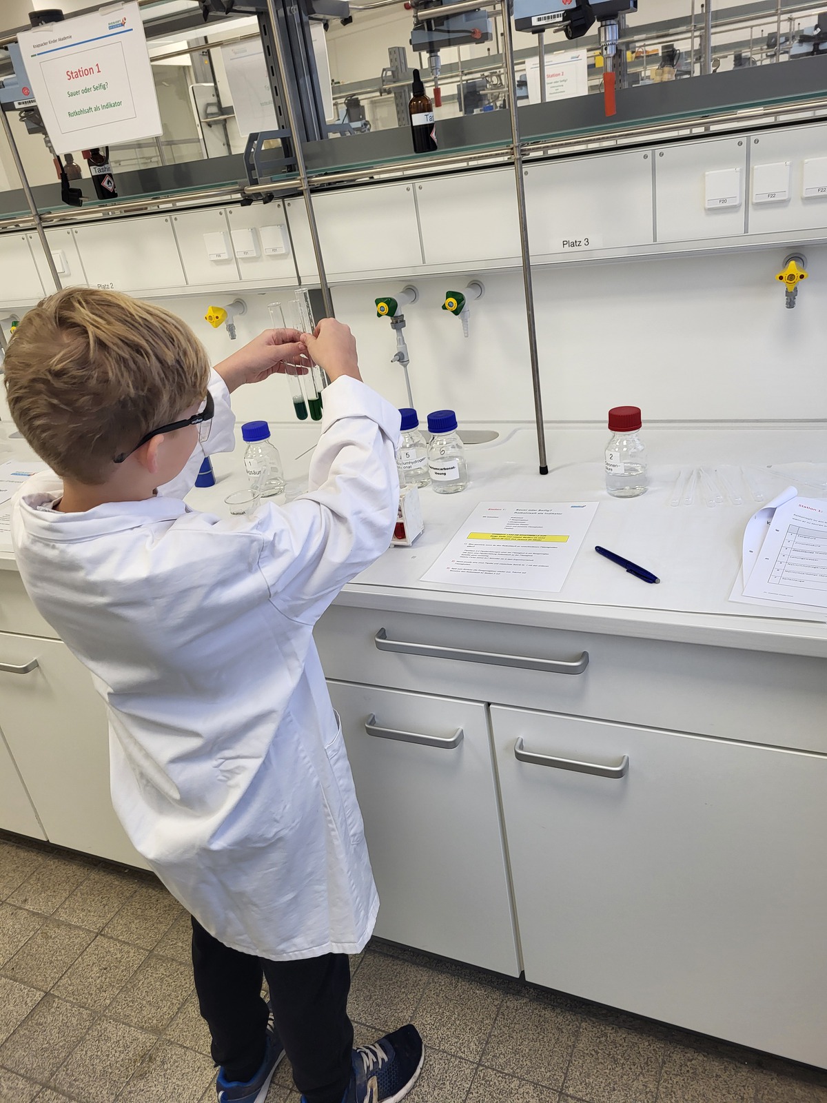 Fast 100 Klassen haben die Kinderakademie seit dem Start 2004 bereits besucht. Jedes Jahr erhalten fünf von ihnen für einen Tag die Gelegenheit, in den Laboren der Rhein-Erft Akademie unter professioneller Anleitung zu experimentieren und zu forschen. Die Kinder kommen aus Grundschulen in Hürth, Kerpen, Erftstadt, Köln und Frechen. Durch ihre Versuche erfahren die Schüler*innen beispielsweise, warum Schwarz nicht gleich Schwarz ist, wie sie einen Feuerlöscher simulieren oder mit Rotkohlsaft Produkte aus dem Haushalt untersuchen. „Bei Säuren verfärbt sich der Rotkohlsaft rot, in neutralen Lösungen blau und bei Basen grün“, erläutert Ausbilder Stefan Königstein, der die Kinderakademie zusammen mit Königsmann organisiert. „Das erklärt, warum Rotkohl in manchen Regionen Blaukraut heißt.“ Auch er schätzt die Begeisterung der Kleinen. „Wenn wir das Prinzip des Feuerlöschers unter die Lupe nehmen, sehen wir immer in große Augen.“ Unterstützt werden die Ausbilder in der Regel durch Schülerpraktikant*innen, die mit den Kindern zusammen forschen und so eine Brücke zwischen den Pänz und den Erwachsenen schaffen.