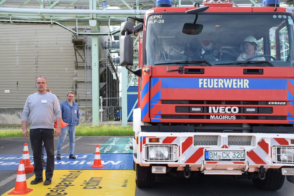 Zu den Themen zählten unter anderem der Umgang mit gelbem Phosphor, der sichere Fasstransport und die Kampagne Stop.Think.Act. Letzteres ein Ansatz, an dem Sandra Schneider, Head of Operations & Supply Chain Additives, die die Veranstaltung eröffnete, besonders liegt. Gemeint ist: Innehalten und eine Situation und das eventuell damit verbundene Risiko einschätzen. Nachdenken, wie man das Risiko sicher entschärfen kann. Erst dann auf die sichere Art handeln. An den Stationen der BG konnten Besucher*innen sich am Handlaufsimulationsmodell versuchen und vom Fahrersitz eines Feuerwehreinsatzwagens einen Perspektivwechsel in Sachen toter Winkel erleben.