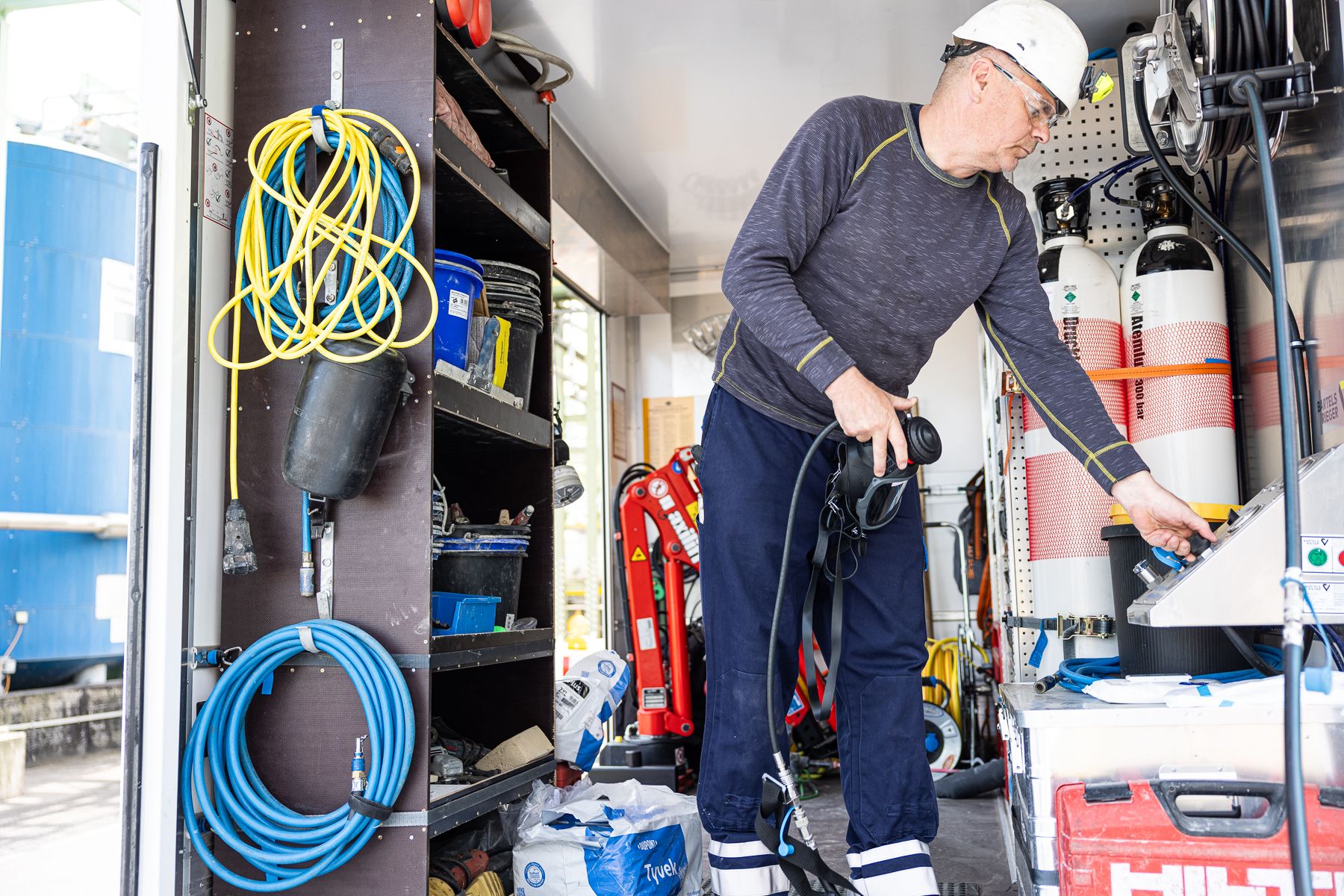 Das gesamte Team hatte sich bei der Planung des Fahrzeugs eingebracht. Das ist das Ergebnis: Ein Notstromaggregat und einen Kompressor zum Aufblasen der Dichtkissen gab es auch im Vorgängermodell, neu ist jedoch die Ausstattung des Fahrzeugs mit einem Kran. Mit diesem können nun die Kanaldichtkissen und die Tauchpumpe, die rund 30 Kilogramm wiegt, heruntergelassen werden. Die Kanäle sind bis zur Kanalsohle fünf bis sechs Meter tief, der tiefste sogar neun Meter. Früher mussten die Männer diese Gewichte manuell tragen, mit Atemmaske und Schutzausrüstung ist dies doppelt schwer. Zudem verfügt das neue Fahrzeug über eine Hebebühne am Heck. Auch diese Neuerung erspart Schlepperei, denn früher musste die Ausstattung von der Pritsche manuell entladen werden. Das Fahrzeug verfügt über ein Luftfahrwerk, damit es per Luftbalg stets austaxiert werden kann und in der Waage steht. Ein Plus an Verkehrsabsicherung bieten die Rundumleuchten und die markante Außenbeleuchtung. Nicht nur auf der Straße, auch auf der Wiese kommt das neue Fahrzeug besser zurecht. „Der fehlende Allradantrieb des Vorgängers machte uns bei unbefestigten Untergründen Probleme“, berichtet Thomas Recher.