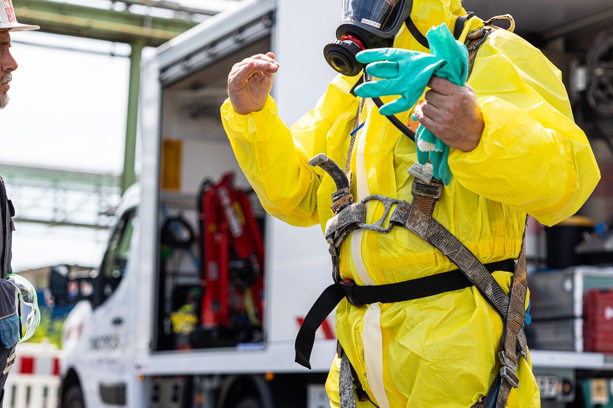 „Das Team Bautechnik kümmert sich um bautechnische Spezialgewerke“, erläutert Thomas Recher, Teamleiter Stillstands-/Baumanagement: „Neben dem klassischen Sonderbau zählen zu unseren Aufgaben auch der Säurebau, Installation von Absturzsicherung und Seilanlagen auf Dächern, Beton- und Dachsanierung, sowie der Brandschutz. Auch die Auswaschungen am Beton in den Kanälen und Schächten sind gemäß Wasserhaushaltsschutzgesetz regelmäßig zu prüfen und zu sanieren. Die Einsatzkräfte in den Kanälen sind unsere Spezialagenten, denn allein das Arbeiten in der notwendigen Schutzausrüstung ist schon sehr belastend – und einen Hang zur Klaustrophobie – Panik in engen Räumen – sollte man auch nicht haben.“ Die Arbeiten im Kanal erfordern hohe Sicherheitsanforderungen, dazu zählt auch eine Atemschutzausrüstung.
