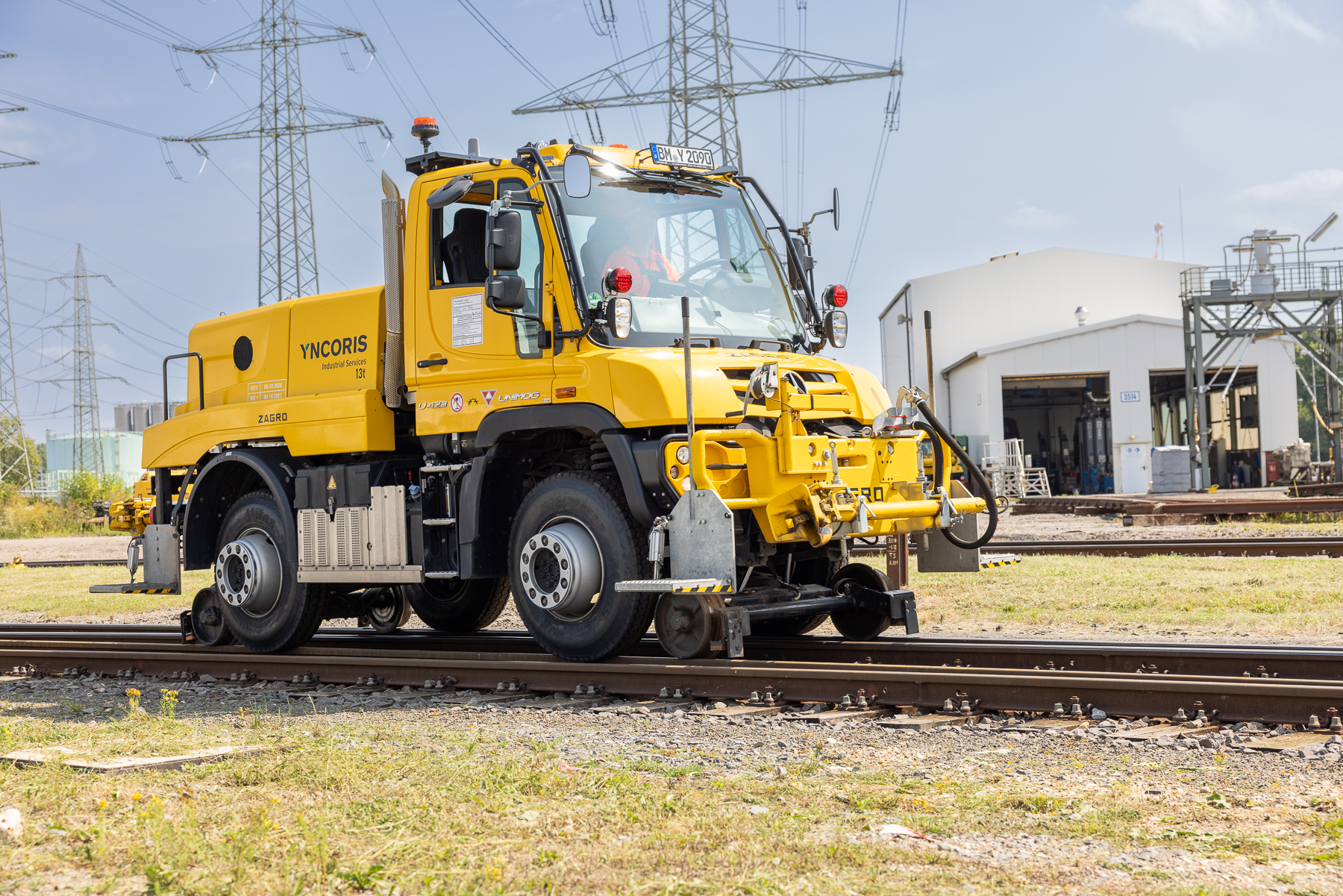 Norbert Rott ist als Quereinsteiger zur YNCORIS gekommen: „Mein Vater war in der Bauleitung einer Gleisbaufirma beschäftigt, dies war auch eine Station meines beruflichen Werdegangs. Diese Weichenstellung hat mich dann hier zum Bahnbetreib im Chemiepark geführt. Mit dem Unimog fahren wir zum Kunden über die Straße, gleisen dort in eine vorhandene Gleisanlage ein, wie beispielsweise an einem Bahnübergang, und dann rangiert der Unimog als Lok die Fracht innerhalb der Gleisanlage des Kunden nach dessen Wünschen. Jeder Kunde hat bei uns oder in seiner Gleisanlage ein Übergabegleis, an dem die Bahnwagen an den Betrieb übergeben werden. Von dort aus nehmen wir die Bahnwagen auf und verteilen sie an die Produktionsanlagen und zurück wie vom Kunden gewünscht.“