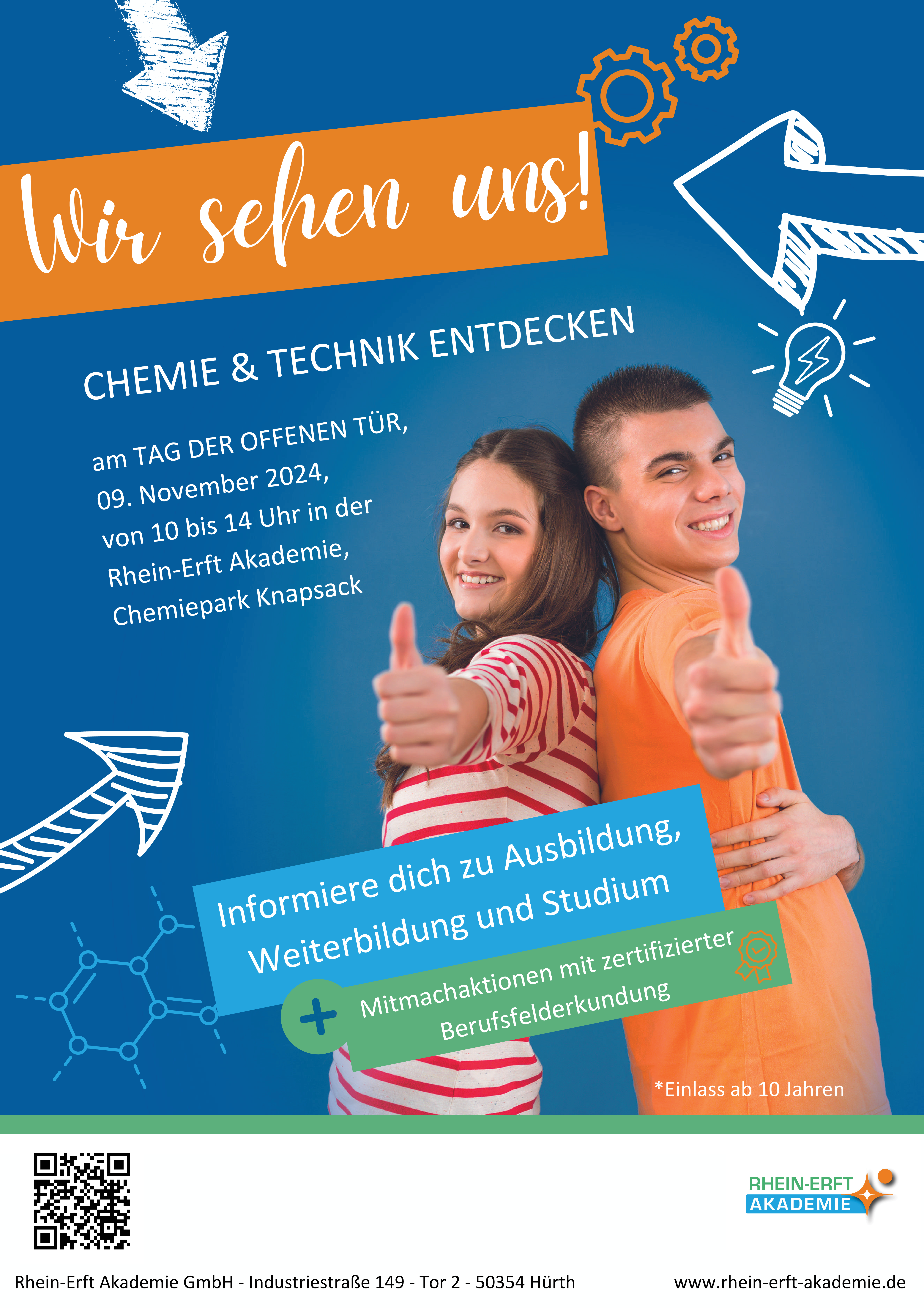 Die Rhein-Erft Akademie bietet interessierten Jugendlichen und Erwachsenen die Möglichkeit, am „Tag der offenen Tür“ zukunftsorientierte Ausbildungsberufe im naturwissenschaftlichen und technischen Bereich kennenzulernen. Der Standortbetreiber vom Chemiepark Knapsack, die Firma YNCORIS GmbH Co. KG ist ebenfalls vor Ort und wird über Ausbildungsberufe im kaufmännischensowie im IT Bereich und im Bereich der Gastronomie informieren.